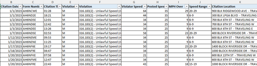 This query returns a list of speeding citations within a date range along with the posted speed and violator speed.