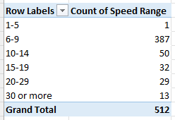 =IF(AND(I2>=1,I2<6),"1-5",IF(AND(I2>=6,I2<=9),"6-9",IF(AND(I2>9,I2<=14),"10-14",IF(AND(I2>14,I2<=19),"15-19",IF(AND(I2>19,I2<=29),"20-29",IF(AND(I2>29,I2<=500),"30 or more",IF(AND(I2=0),"No Speeds Indicated")))))))