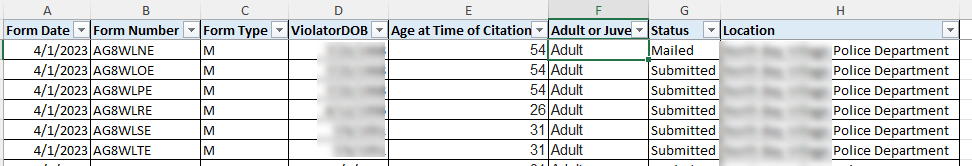 This query returns parking citations and warnings within a date range.   There are optional parameters for location, form number, ordinance type , tag number, violation, and officer name.