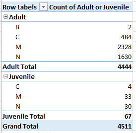 Create a Pivot Table to count citations issued to Adults vs. Juveniles.   Add the Form Type desired to break out the type of violation (Moving, Non-moving, etc.).