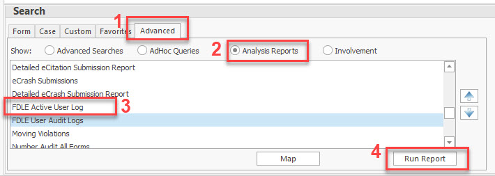 In Forms Manager, go to the Search tab and select Analysis reports and pick FDLE Active User Log.