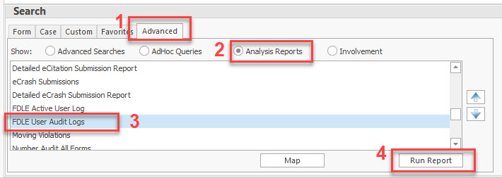 In Forms Manager, go to the Search tab and select Analysis reports and pick FDLE User Audit Logs.