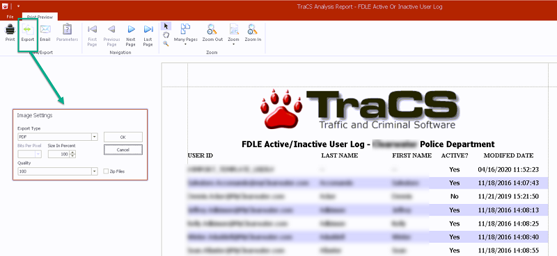 Reports may be printed or sent via email and they may be exported to PDF, Excel, or image file.   The Print, Export, and Email buttons are in the upper left corner of the report.