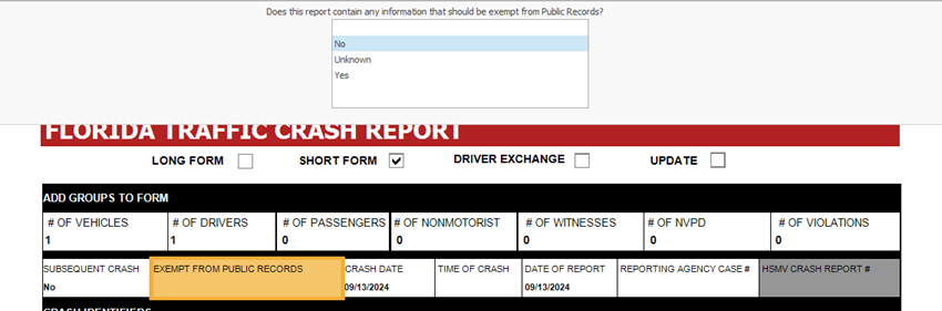 If any of the involved parties in a crash are exempt per FSS 119.071(4), officers should select Yes in the Exempt From Public Records field at the top of the crash form. This includes drivers, vehicle owners, passengers, non-motorists, and witnesses. Officers should not use the Exempt From Public Records field to indicate 60-day exemptions under 316.066(2)(b).