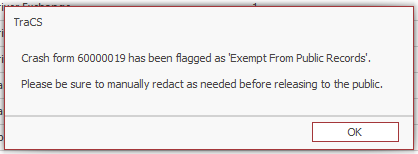 If the field is marked YES, this is an indication to the agency that someone in the crash is exempt. This includes drivers, vehicle owners, passengers, non-motorists, and witnesses who are exempt. If the crash is printed, a warning will pop up stating that it has been flagged as exempt. It is up to the agency to determine who that is and redact accordingly.