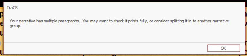 If the officer goes over this limit, a warning will pop up telling them to consider splitting it onto another narrative group.   This warning comes up multiple times while the officer is working on the crash.