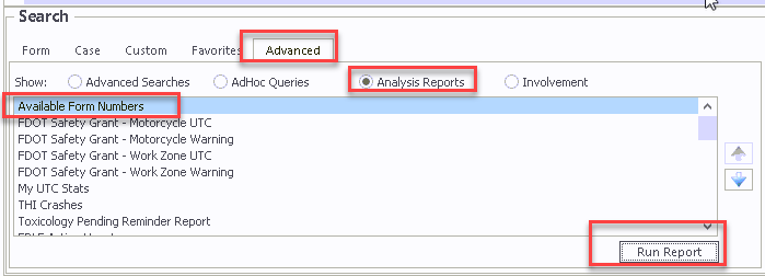 Someone at the agency should run the Available Form Numbers analysis report on a regular basis. You don't want your officers to be on a crash scene or out on the road with a violator and not be able to pull a crash or UTC number because you have run out.