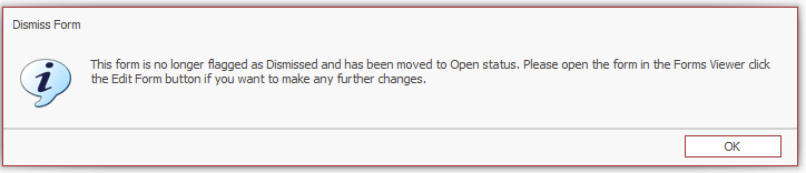 A warning will come up asking if you are sure you want to flag the form as dismissed. Pressing Yes will change the status to Dismissed.