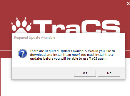 When the installation is complete, TraCS will launch and connect to the update server. Answer Yes to the prompt asking if you want to install updates. Once updates run, installation is complete.