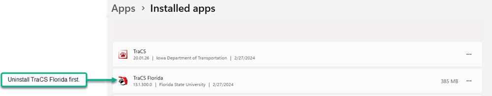 Do not uninstall TraCS from the Start menu. Do it from Add/Remove Programs in the Control Panel so you can be sure that both TraCS Florida and the TraCS baseline are uninstalled.