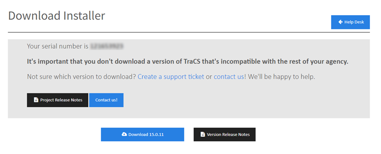 Non-hosted agencies are either on 15.0.18 or one of the V16 versions. If you are on V15, you should continue to use the 15.0.18 installer. If you are on V16, going forward, you must use and installer that is 16.0.0 or higher for any new installations. TraCS will not work properly on the client machine if an older installer is used. Delete any older installers that you have saved. If you have an image or you deploy via group policy (GPO) or silent install (MSI), be sure you are using version 16.0.0 or higher.