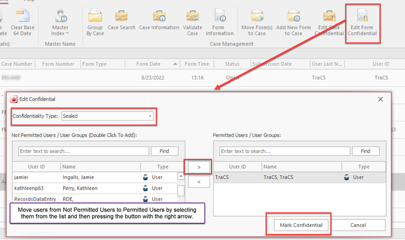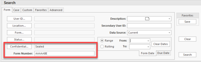 To search for Sealed forms, permitted users should search by form number or case number as usual, but change the Confidential field to Sealed before pressing Search.