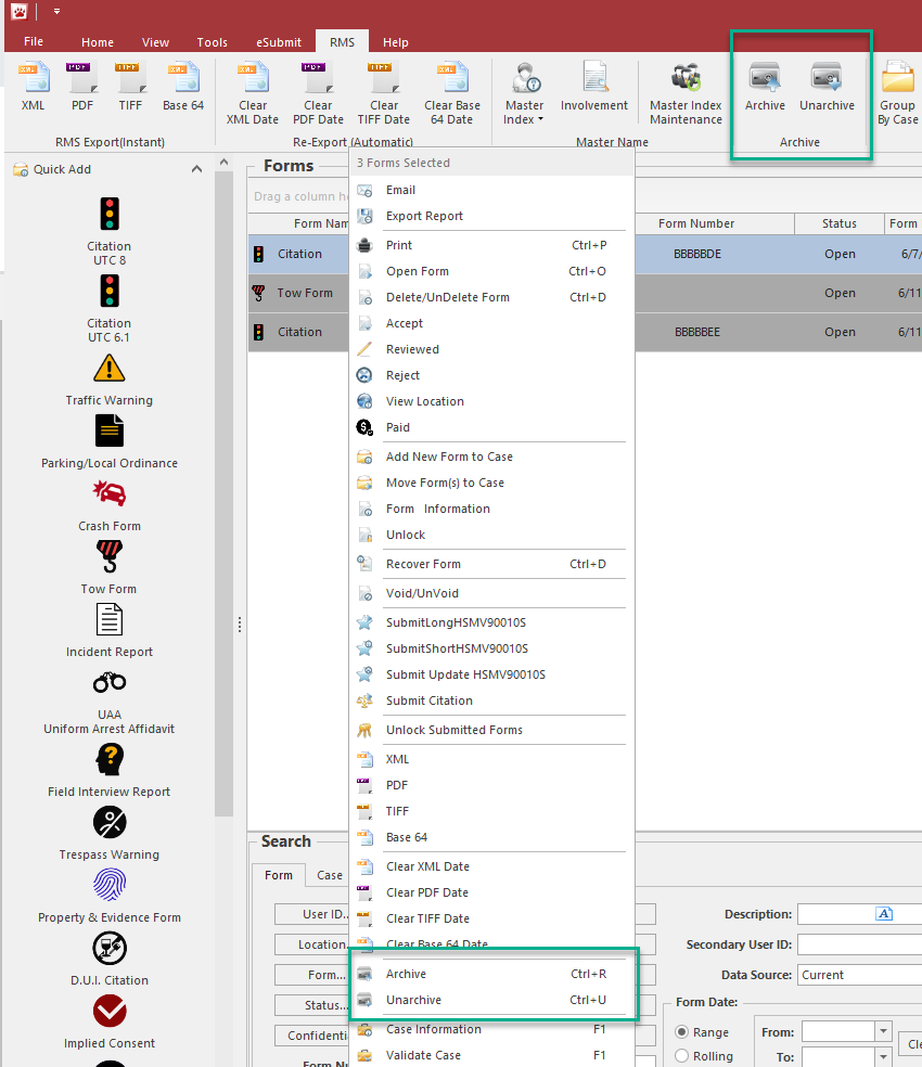 7. This step may only be completed on the server or on a machine in Office mode.   Highlight the form and go to the RMS tab and press Archive or right click on the closed form and press Archive.