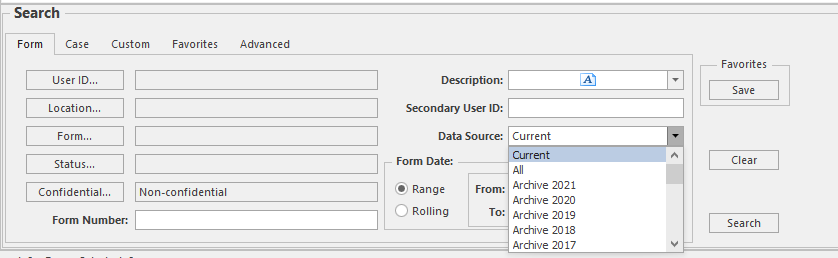 Users should search by form number or case number as usual but change the Data Source from Current to All before pressing Search.