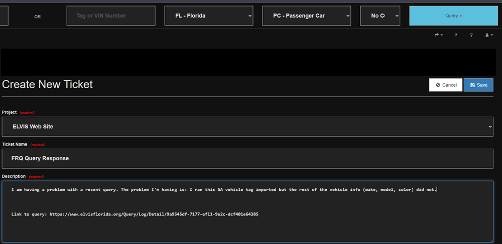 For example, "Vehicle tag imported but the rest of the vehicle info did not." or "GA registration. Vehicle did not import at all." Press Save and the ELVIS team will look into the issue.