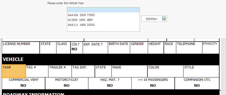If you exit out of a form and then need to go back and change a person or vehicle, clear out the existing information and then press the ELVIS button and the list will appear. To clear out the information, go to the Last Name field (person) or Year field (vehicle) and press Clear at the upper right.