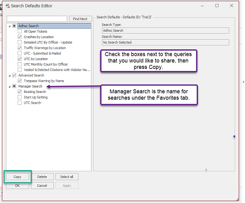 Expand the search types and check the boxed next to the queries to be shared and press Copy.