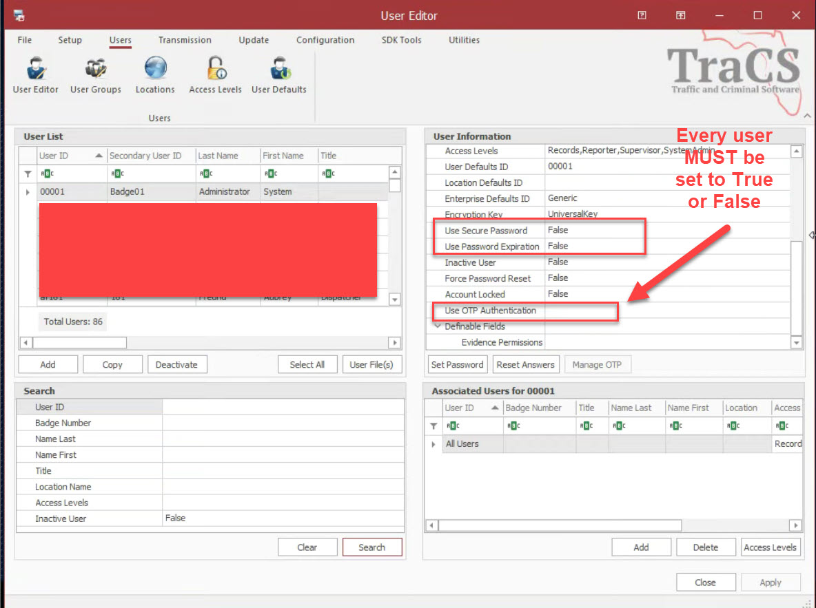 Once the server is configured, ALL users must be configured immediately. All active users must be set to either True or False for Use OTP Authentication.