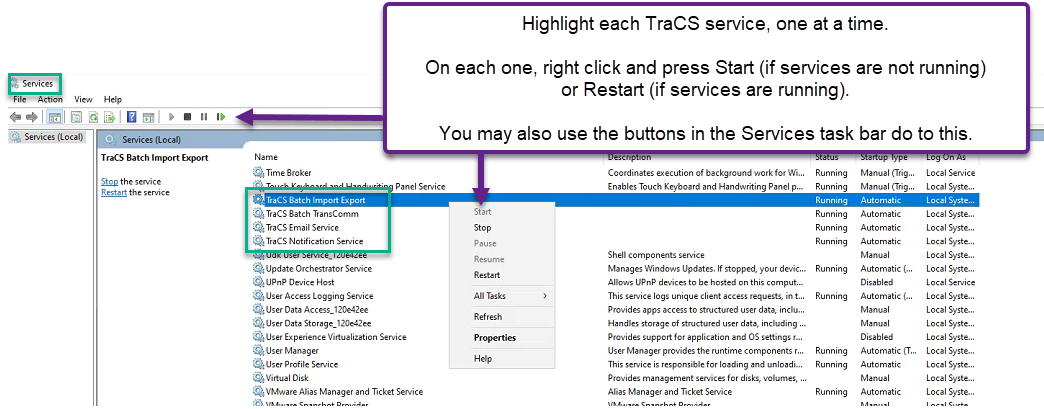 On the application server, open the Services application. Scroll down until you see the four TraCS services. Restart all four, even if they show as Running. If that fixes the issue, email services should resume shortly after the restart. You may have to wait up to 1 day to confirm that export services have resumed.