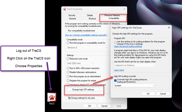 5. On the next popup, check the box next to Override high DPI scaling behavior. Do not check any other boxes on this screen.