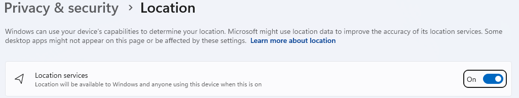 Windows 11 - In Windows, go to Privacy & Security, then Location.   Location Services must be On.