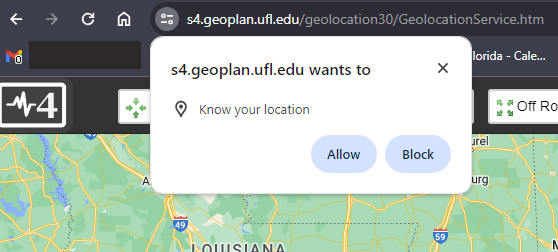 The first time users launch the tool, they should get a pop up stating that s4.geoplan.ufl.edu wants to know their location.   They must press Allow or the map will not work properly.