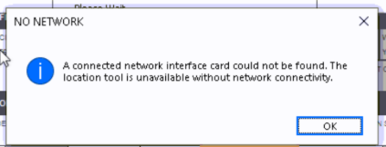 If you are getting a pop up that states, "NO NETWORK… A connected network interface card could not be found.   The location tool is unavailable without network connectivity.", this means that TraCS is attempting to obtain the MAC address as a step in verifying a good, secure connection, and nothing is being returned to it.   Your network, firewall, anti-virus, and/or VPN need to be adjusted.   See this page for exceptions that must be added.