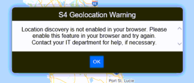 When location services are enabled for the operating system and allowed in the browser, the S4 Location Tool attempts to use the browser’s geolocation service API to initialize the map near the location of the user.   The inner workings of these algorithms are proprietary to each browser, which Signal 4 has no control over, and they can be thrown off by a VPN.   If the browser geolocation doesn’t return a point inside of Florida, then the center of your agency’s jurisdiction is used to initialize the map instead.   The Show My Location button will give the results of the browser's geolocation, so it may be necessary for officers to use the location search bar at the upper right to jump to their location on the map.