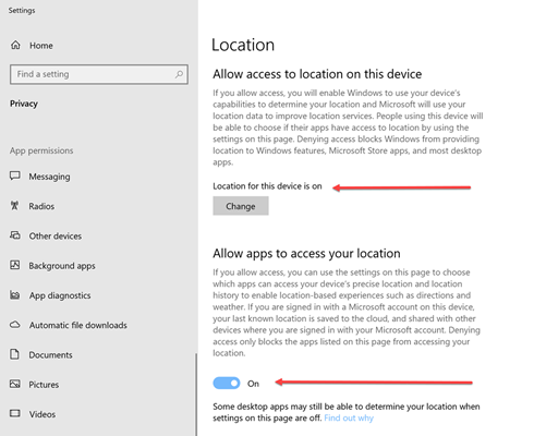 Windows 10 - In Windows, go to Location.   Both Location for this Device and Location must be On.