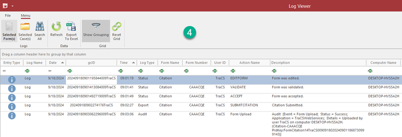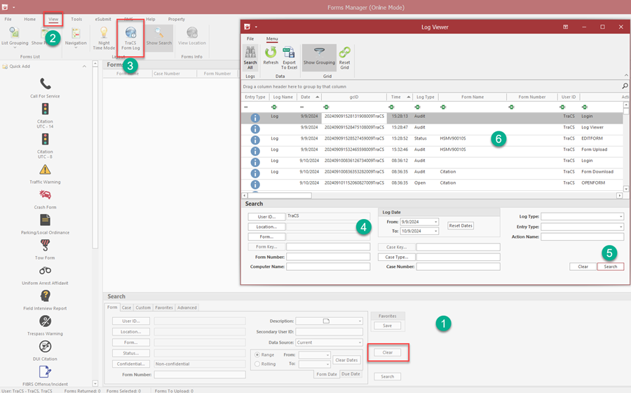 Agency administrators may access the TraCS Form Log to look at activity for a date range, user, form, computer, form key, or form number.