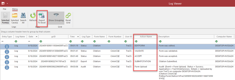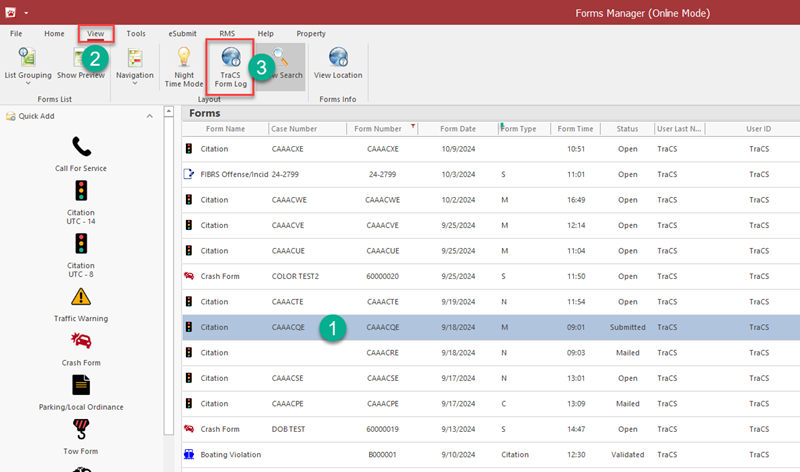 To look at all activity for a particular form, with the form closed, highlight it, go to the View tab, and press the TraCS Form Log button.